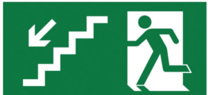 Placa S9; sinalizadora de indicação Escada de Emergência – Seta Abaixo esquerda.